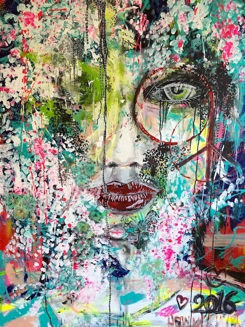 ARTWORK "LOOK AT ME" Large Modern Painting: Dutch Contemporary Art. Mixed media on canvas -. Abstract Artwork with vibrant colors, graffiti style, and powerful presence for a warm and contemporary interior. Women's face and eyes on canvas. by Artist Amber Houweling
